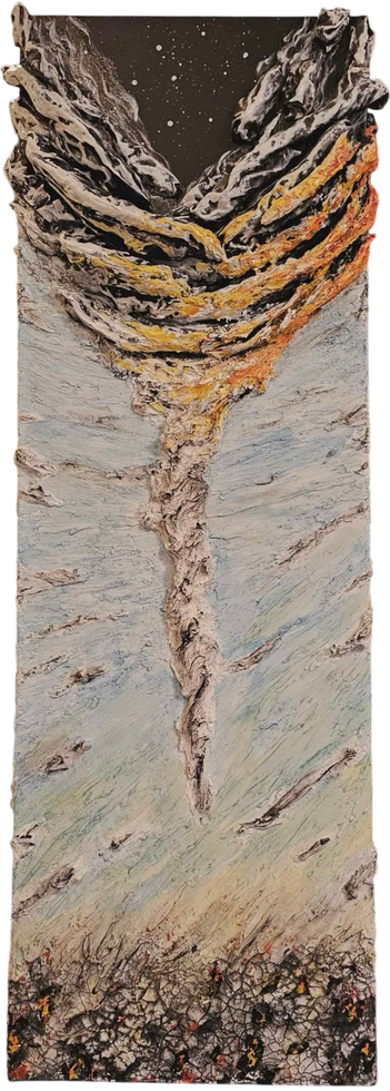 Entrez dans l'univers de l'œuvre structurale "Entre deux mondes", où la puissance d'une tornade est capturée à travers l'utilisation de tissus et de mortier. Les teintes vibrantes de jaune, rouge, bleu, noir et blanc se mêlent pour créer une explosion de couleurs acryliques qui contrastent avec la force brutale de la nature. La toile représente la lutte constante de la nature qui se bat entre deux mondes, capturant l'énergie inarrêtable de la tempête. Chaque détail de cette pièce est un hommage à la beauté sauvage de l'environnement, faisant de cette œuvre d'art un ajout saisissant à toute collection. Plongez dans l'émotion et la force de "Entre deux mondes" et laissez-vous emporter par l'expression artistique de cette tumultueuse dualité.