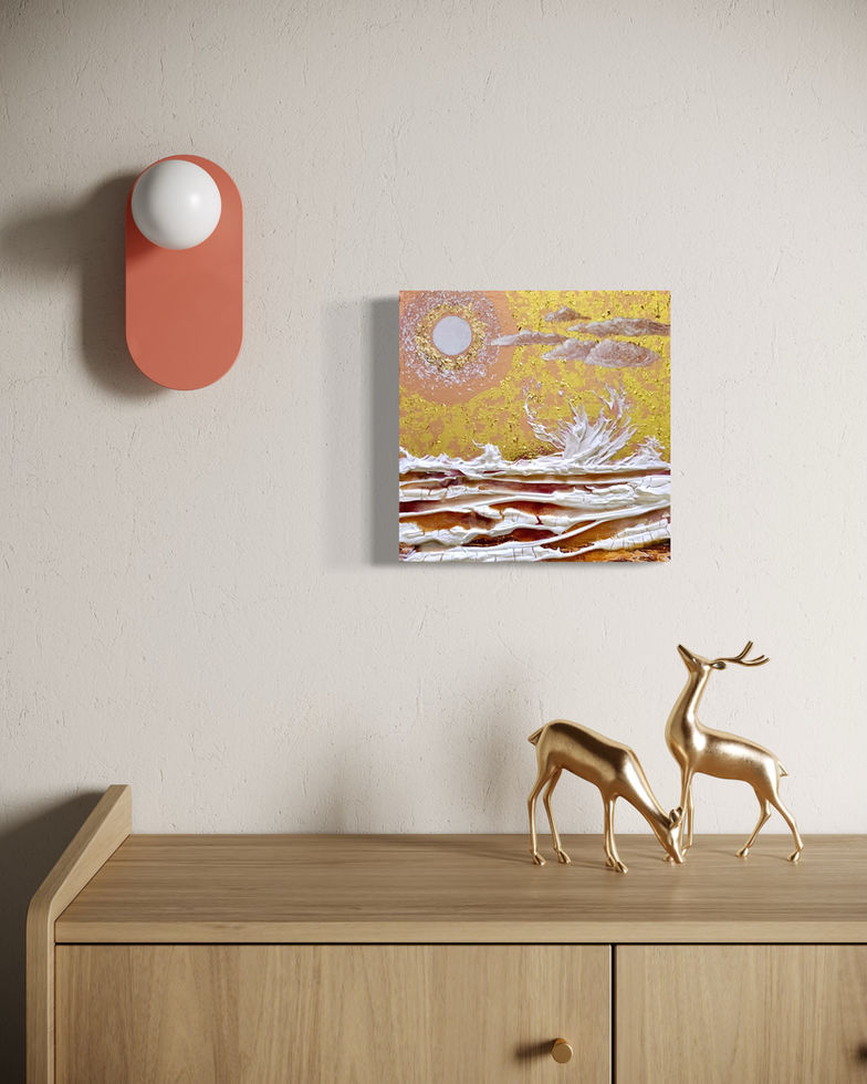 La fusion solaire est une œuvre d'art spectaculaire qui capture la rencontre entre le ciel et la mer. Un ciel doré magnifiquement réalisé abrite un astre imposant, entouré de feuilles d'or et de flocons scintillants. Cette scène céleste est contrée par la force brute de la mer, avec des vagues sculptées en mortier semblant prêtes à briser le calme. Le fond d'image rose doré, parsemé de fragments métallisés, renforce la tension entre l'éclat céleste et l'agitation terrestr. La fusion solaire est une pièce captivante qui évoque la dualité de la nature et la complexité de l'équilibre entre calme et mouvement.