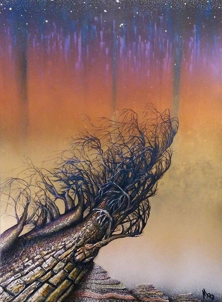 Cet arbre, dont les reliefs sont créés avec du tissu peint à l'acrylique, est représenté tombant devant des montagnes de petites pierres sur un fond flou peint avec de la peinture aérosol. Cette combinaison crée une atmosphère apocalyptique captivante qui ne manquera pas de susciter des émotions intenses chez les spectateurs. "Il était une fois" peut être interprété comme le dernier arbre, illustrant un avenir que personne ne souhaite voir, mais qui captivera tous ceux qui auront la chance d'avoir cette œuvre sur leurs murs.