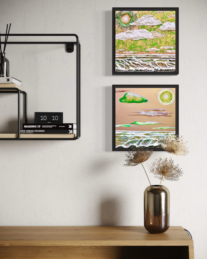 Dans un monde baigné d’or, une œuvre d'art unique intitulée Onde Solaire vous transporte au cœur d'un paysage marin enchanteur. La mer fougueuse qui vient embrasser des pierres précieuses crée une scène d'une beauté à couper le souffle. Le soleil, auréolé de perles d’un vert scintillant, règne en maître sur cette composition éclatante, tandis que les nuages en suspension sculptent un ciel d’opulence. Chaque détail, des vagues tumultueuses aux craquelures dans les rochers, témoigne d’un élan vital qui éveille les sens et suscite l'admiration. Qu'il s'agisse de revivre des moments passés à contempler la beauté naturelle ou d'admirer la créativité artistique, l'Onde Solaire offre une expérience visuelle à la fois saisissante et apaisante. Commandez dès aujourd'hui cette pièce unique pour ajouter une touche spectaculaire à votre collection d'œuvres d'art.